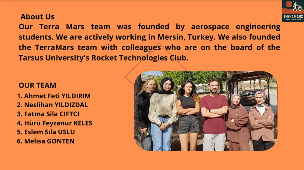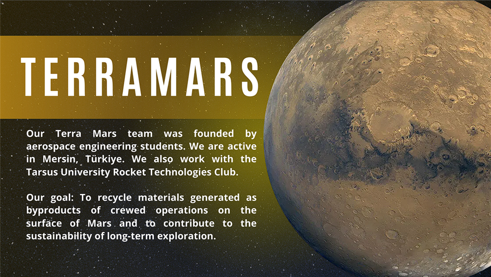 Tamamı Havacılık ve Uzay Mühendisliği öğrencilerinden oluşan "TerraMars" ekibimiz, "Mars'taki Atık Maddelerin Geri Dönüştürülerek İnsanlı Uzay Görevlerine Etkisi" konseptli projesi ile Adana, Mersin, Şanlıurfa, Elazığ, Antalya ve Malatya gibi çevre illerden de katılımın olduğu yarışmada yerelde birincilik kazandı.